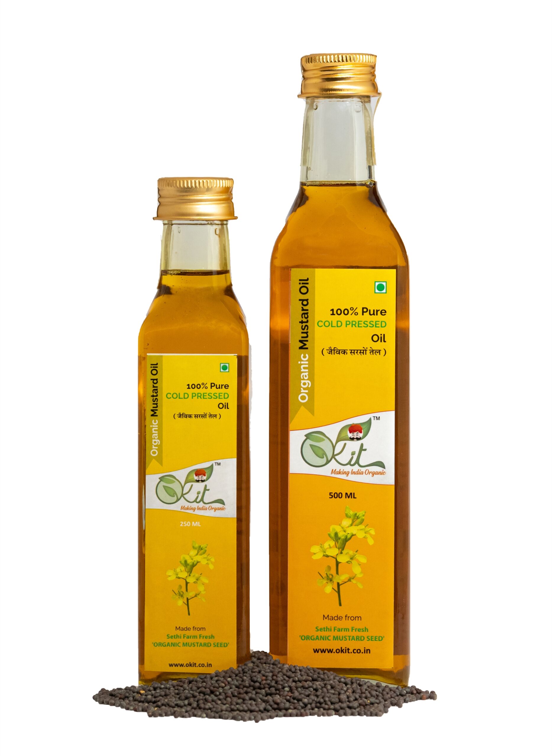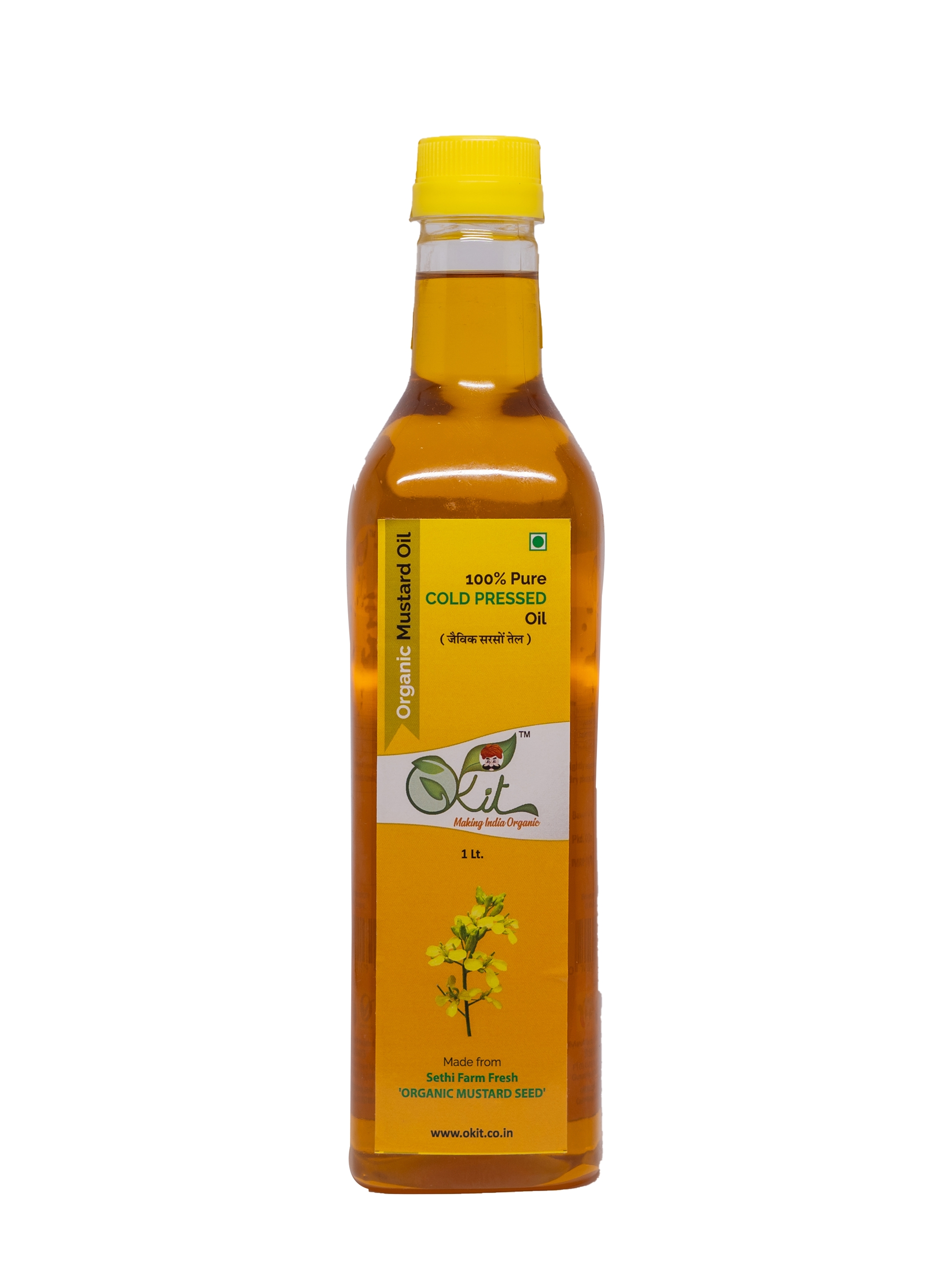 OKIT Organic mustard oil is extracted from mustard seeds that are grown without synthetic pesticides, fertilizers. It is typically cold-pressed, ensuring it retains its natural nutrients, strong aroma, and pungent taste.